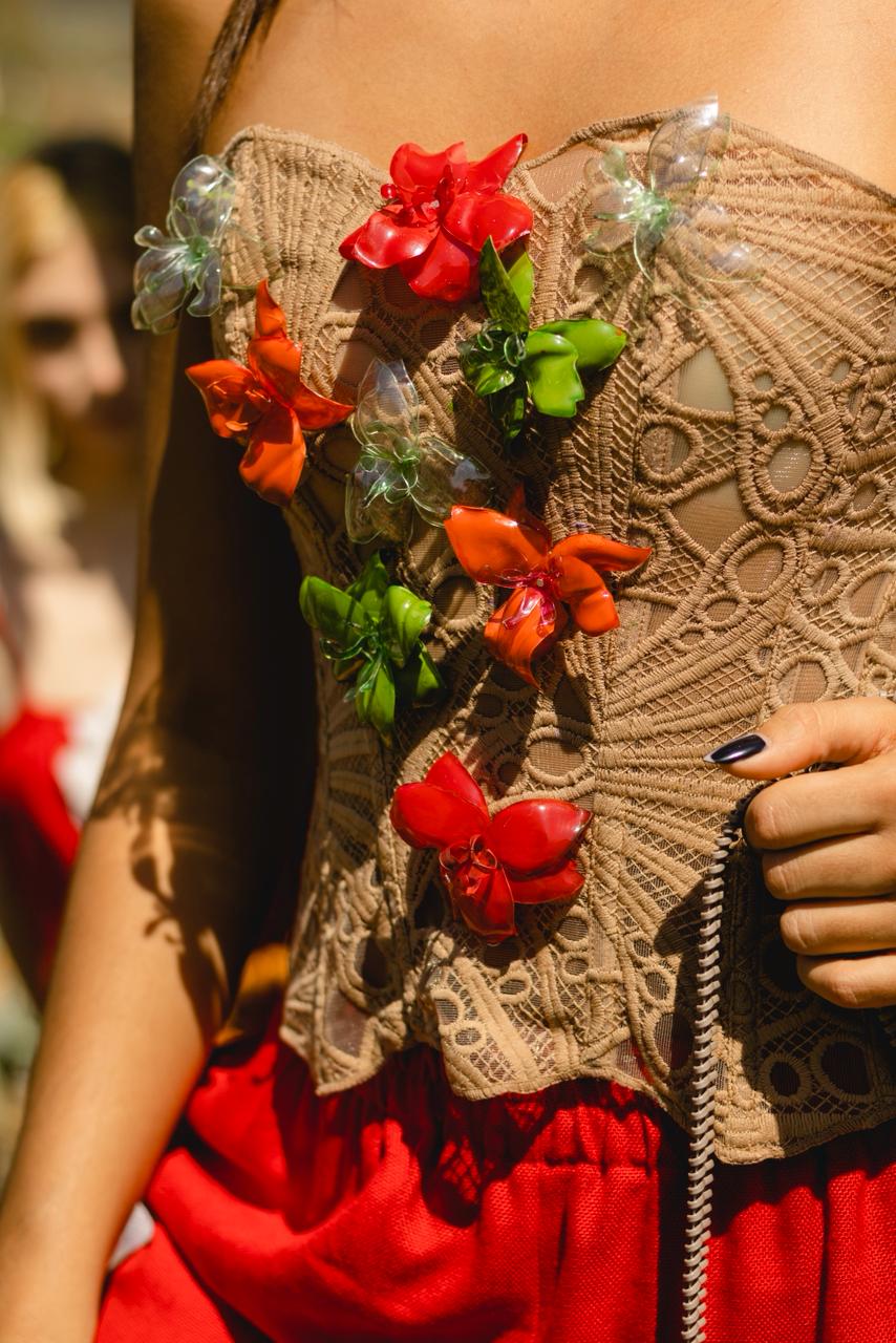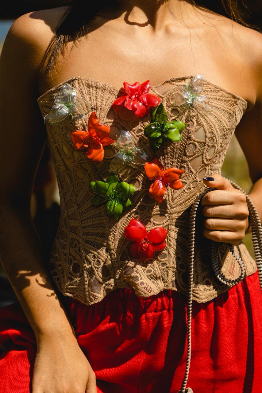 Adjustable lace corset crafted with eco-conscious design. This small-sized piece features delicate embroidery created from recycled plastic bottles, combining sustainable fashion with elegant style.